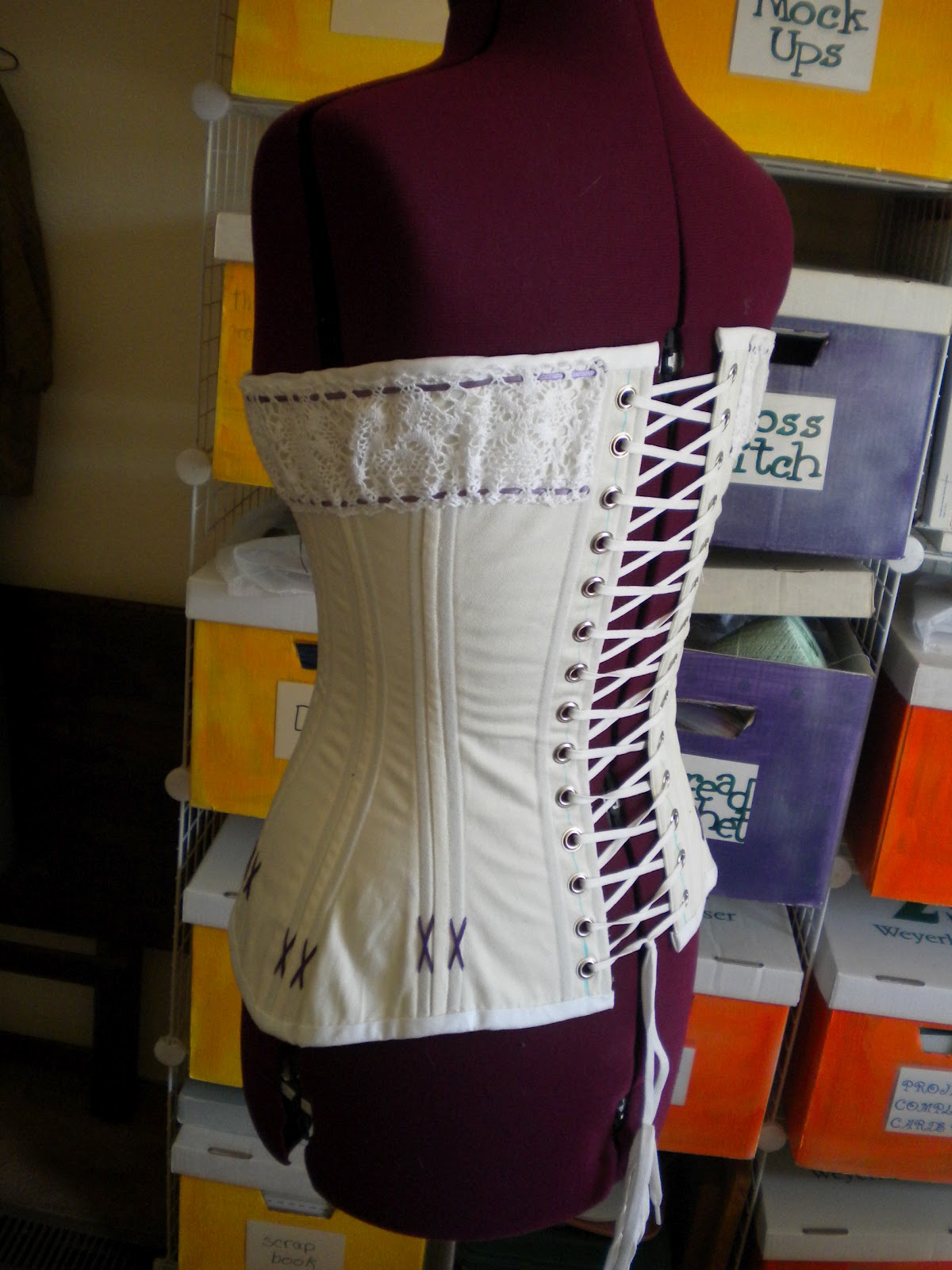 Fun stuff. sewing the X's at the bottom of the boning, and putting the wide lace at the top.